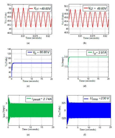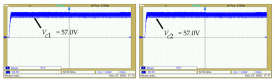 The current charges the capacitors and to a voltage equal to , as represented in Equation (8). Then, the average voltage is expressed as follows: