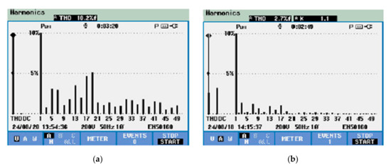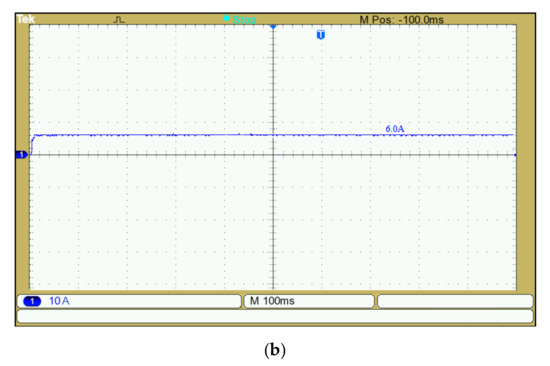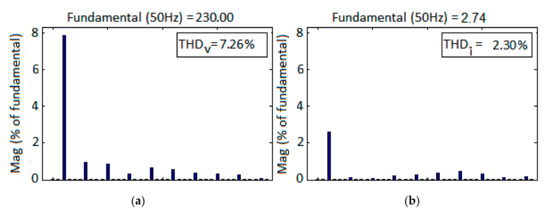 In this mode (Figure 5a), the inverter is operated at a frequency of 20 kHz with a fundamental frequency of 50 Hz. The positive half cycle of the sinusoidal PWM inverter comprises the embedded dc–dc converter, operated at both non-shoot through and shoot through modes at a frequency of 500 Hz.