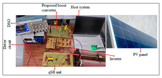 The inverter is operated to generate a sinusoidal output waveform at a fundamental frequency of 50 Hz and a switching frequency of 20 kHz to power the domestic appliances. The proposed inverter is embedded with a DC–DC converter, which is operated at a frequency of 500 Hz to provide a continuous dc-link voltage without the link components. The non-shoot through and shoot through modes of the DC–DC converter are the same at both stages of the inverter operation. The embedded DC–DC converter during each inversion cycles keeps the voltage constant across the capacitors and . Thus, the capacitors supply energy to the inverter simultaneously. The design parameters of the proposed SHGqBI are shown in Table 2.