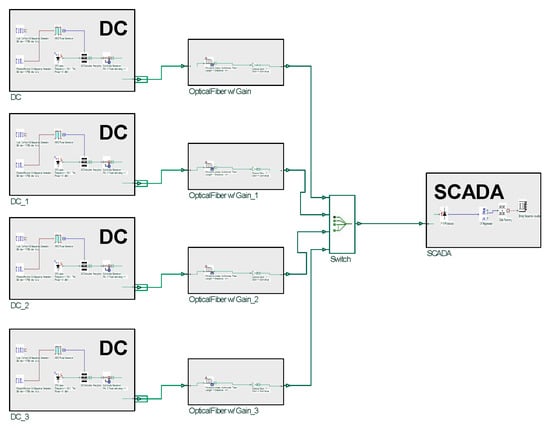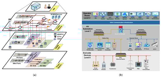 The research on enhanced SCADA systems has become essential, mainly due to the integration of HVDC and low-carbon technologies such as wind and solar generation. The hybrid HVDC/AC networks require faster, robust and complex SCADA systems []. The recent researches have discussed the SCADA hardware and software upgrades and modifications. New communication infrastructures are proposed to cover AC and DC requirements [,,] and new DC side RTUs are currently being characterised and researched [,,]. A complete modern SCADA communication infrastructure can be split into four layers as shown in Figure 1a [,,]: