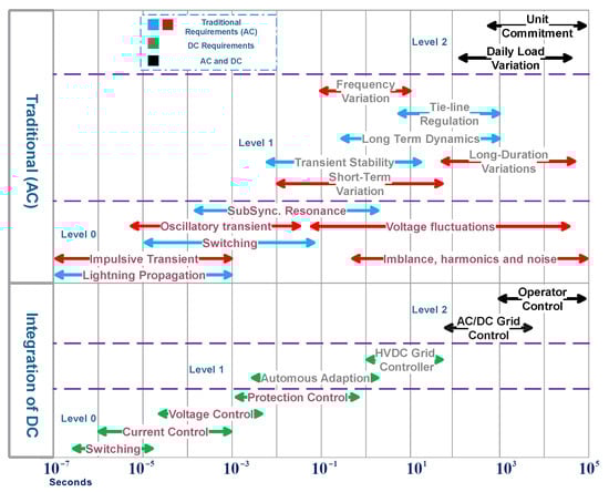 The main challenge appears in the timescale of the modern SCADA communication network due to the intensive integration of low-carbon technologies. New time requirements are required for a stable and robust SCADA system. Figure 2 shows the bigger picture of the timescales requirements in a modern hybrid HVDC/AC network SCADA [,,,]. The different timescale requirements between the traditional AC networks and the HVDC demands an update to the communication system. It has to be faster and able to handle more control units and data bandwidth [,,]. In addition, the traditional messaging protocols (such as IEEE C37.118 [] and IEEE 1646 []) have to be restudied to include HVDC messages characteristics.