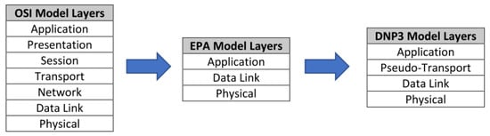 Figure 3. OSI, EPA and DNP3 Models. - IEC 60870-5: the protocol is based on EPA model and was developed by IEC. An additional layer is added called the User Application layer. It is a front-end layer that can be used to set up the functions of the telecontrol system to interact with the SCADA hardware devices []. There are several versions of the protocol 60870-5-(101 to 104), each with different data objects, functions codes, and specifications. The most generic one is 101, which has basic definitions of the data objects, the geographical areas, and the WAN technology. The 104 version has two additional layers from the OSI model to deal with TCP/IP protocols (Figure 4) [,]. This protocol is used in power transmission and distribution SCADA’s, with a data transfer speed of 64 kbits/s depending on the interface of the IEC 60870-5 [].
