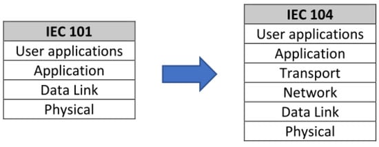 Figure 4. IEC 101 and 104 layers. - IEC 60870-6: is known as Inter-Control Center Communications Protocol (ICCP), globally used for telecontrol of SCADA. TASE.2 version of the standard has 5–7 layers of the OSI model. It is used to connect command centres of SCADA together, and exchange measurements, time-tagged data and events [].