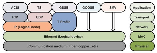 Figure 5. IEC 61850 communication stack model. - Profibus or the “Process field bus”: is an OSI model protocol used in the industrial monitoring environment. It has a bus control unit that establishes the connection between the different hardware equipment. Usually, it has a type D connector, 127 points of data, speed up to 12 Mbps, and a data message size up to 244 bytes per node []. There are three standard versions of the Profibus; Field bus Message Specification, Distributed Peripheral, and Processes Automation. The Distributed Peripheral version data speed can vary between 93.75 kbps and 12 Mbps for a distance of 1.2 Km and 100 m, respectively [].