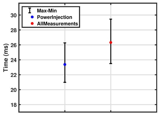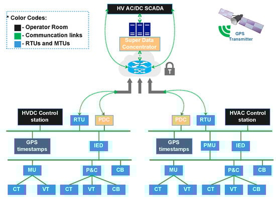 PDCs are used to collect time-synchronized data from multiple PMUs. Centralized PDCs are commonly used in multi-stage data concentration (hierarchical network) []. The PMU is one of the main RTUs in the AC transmission networks, PMUs aim to improve the availability of the system states and maintain system stability []. They act 100 times faster than the SCADA by analysing the measured data in real-time and activating built-in/pre-programmed protection functions. The decision-making process (including the reading of data from sensors) inside the PMUs takes between 10 and 100 ms, while PDCs can take 100 ms and 1 s [].