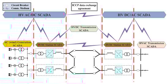 Modern power networks are controlled by different electric utilities (SCADAs), as shown in Figure 7. Therefore, there is a need for an ICCP data exchange agreement (IEC 60870-6/TASE.2) to be defined. It will enable data exchange between the different AC and DC network operators. However, the lack of a standardized version of the protocol has limited and restricted the communication between the network’s operators []. ICCP can establish an unified SCADA interface of a hybrid network with several unified toolboxes, for example, hybrid AC/DC state estimator. In addition, it will increase the power availability and reliability during abnormal conditions and blackouts [,].