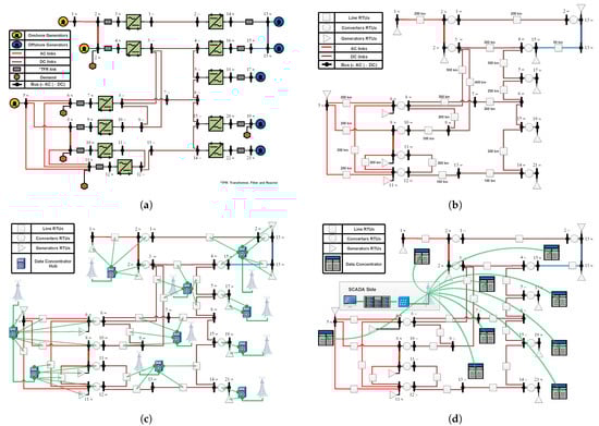 The RTUs are presented in the power network under different titles; Phasor Measurements Unit (PMU)s, and Intelligent Electronic Devices (IED)s. In industry, Phasor Data Concentrator (PDC)s (IEEE C37.244) are refereed as a superior RTUs, where data are collected and aggregated from RTUs in a synchronized multi-staged structure. The standard IEC 61850 defines the automation and communication structure between substations, within substations and RTUs []. The standard provides constrains for data acquisition, protection and data exchange between different types of RTUs []. IED is an emerging technology that is reconfigurable and extendable, since it is based on Field-Programmable Gate Array (FPGA) technology. There are three different types of IEDs; circuit breaker (CB) only, merging unit (MU), and protection and control (P&C) [,]. MU-IEDs are used for data acquisition from current and voltage transformers (sensors), while CB-IEDs are used to monitor and control the circuit breaker states []. P&C-IEDs combine the protection and data acquisition features with an extended I/O ports [,]. With the integration of the HVDC technology, the IEDs became the generic name for the measuring and control devices in AC and DC systems [].