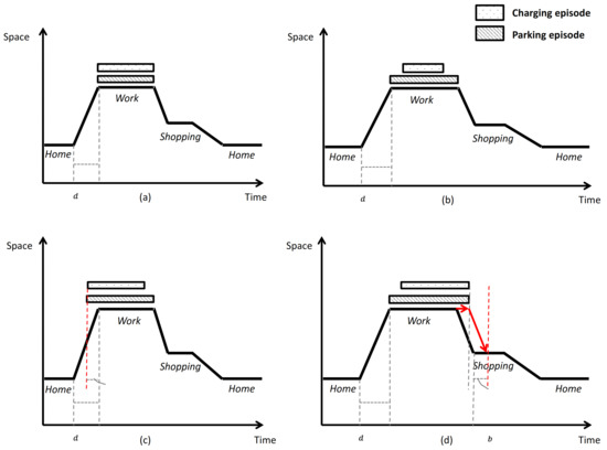 Graphical representation of charging-induced schedule delay for four scenarios: (a) there is no schedule disutility, as the charging and the parking episodes are identical; (b) there is no schedule disutility, as the charging episode is a subset of the parking episode; (c) there is Charging-Induced Schedule Delay Early (CISDE) because both episodes start before the Preferred Arrival Time (PAT); and (d) there is Charging-Induced Schedule Delay Late (CISDL) for the next activity because both episodes finish later than the typical departure time. The red dotted lines in (c,d) represent the actual arrival times that are different from the preferred arrival times.