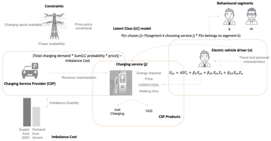 Decomposed elements of the choice-based revenue-management approach. The choice probability for a charging service for an electric vehicle driver affects the revenue outcome for the CSP. Simultaneously, the price, which is the decision variable of the optimization problem, can alter the choice probability, creating a closed-loop formulation with a nonlinear objective function.
