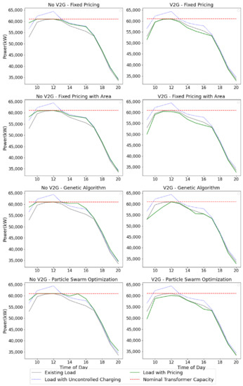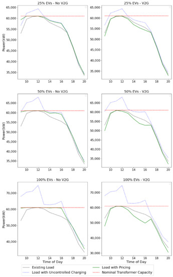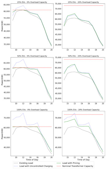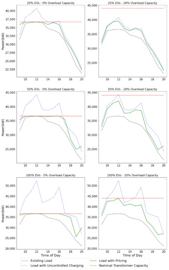 The overload capacity can generally fluctuate between local distribution networks. Typically, distribution transformers are replaced when the peak demand grows to be almost equal to the installed capacity. Figure 4 demonstrates the capacities that were selected for the simulation, which in both cases, were 20% higher than the peak value of the base load.