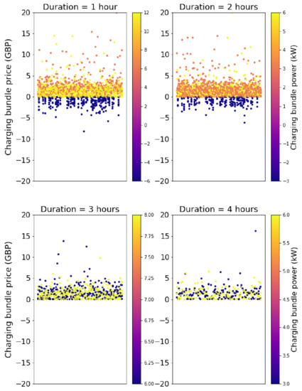 The next step in the analysis was to understand how the optimal prices were related to the attributes of the charging bundles. Figure 12 demonstrates a classification of the prices that were generated with the GA solution by power and charging duration. It is observed that short-duration, high-power bundles tend to be more dispersed around 0 compared to long-duration, low-power bundles. This is essentially an indirect reward to users that strain the power network less by spreading their charging demand over time.