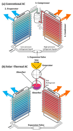 Schematic diagram and working principle of (a) conventional vapor compression air-conditioning system, and (b) solar thermal liquid desiccant dehumidification-based air-conditioning system, reproduced from [50].