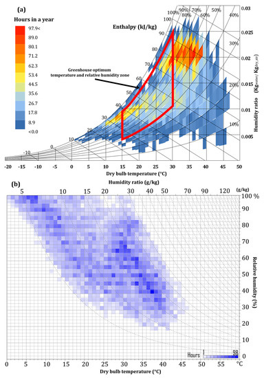 Ambient climatic conditions of Multan (Pakistan) on (a) psychrometric chart, and (b) relative humidity chart.