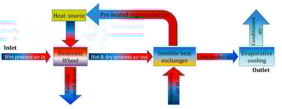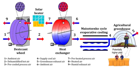 A general working principle of the M-DAC system is first shown in Figure 4, followed by a schematic representation in Figure 5 that demonstrates the application of the proposed system for greenhouse air-conditioning for a possible higher yield. Taking into account the climatic conditions of Multan (Pakistan), the performance of a silica gel-based desiccant wheel for M-DAC system was investigated using Equations (1)–(4), as described in the literature [52,53].