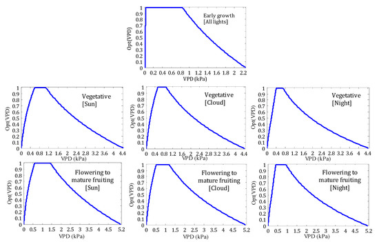 Dynamic assessment of the proposed M-DAC system for greenhouse crop production application was carried out by means of two microclimate models, namely, OptDeg [55] and Cft-ratio [56] that take into account VPD measurements as inputs. The output of the first model, optimality degree of VPD, denoted by is a quantitative value between 0 and 1 that represents how close a VPD reading inside the greenhouse is to the optimum value () at a specific growth stage (GS) and light condition. Graphical representation of the membership functions for defining Opt(VPD) under different conditions is provided in Figure 6. In this model, a VPD measurement in the greenhouse is first calculated from Equation (7) at the time (where and refer to a specific minute and date of the growing stage), and is then mapped to a value between 0 and 1 that quantifies the optimality degree of the microclimate for greenhouse production. In other words, an optimality-degree equal to 1 refers to a high potential yield with marketable value and high-quality fruit.