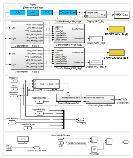 The OptDeg model determines the variation of a single VPD measurement from the optimal references in an instant time. Although this model can provide an overview of the performance of the M-DAC system in sample time, a different model called comfort ratio, denoted by Cft-ratio, that incorporates a sample time frame, such as 24 h was used. The comfort ratio of VPD, denoted by , represents the percent of vapor pressure deficit at a specific time and growth stage, which lies between the reference conditions of vapor pressure deficit related to . Ideal microclimate conditions inside a greenhouse could potentially be defined as . Self-adjusted optimality degree is denoted by to define the reference conditions required for performance evaluation of the proposed M-DAC system or control for microclimate evaluation. The set of Simulink blocks that were implemented to determine the Cft-ratio of the VPD values for different generated from the M-DAC system are shown in Figure 7. For this research, we selected three levels of as 0, 0.5, and 1, representing failure, marginal, and ideal production. It is worth mentioning that OptDeg and Cft-ratio models were derived with a prime focus on improved fruit quality and yield. The derivations at the back of the models (which can be found in published literature) for greenhouse tomato production were condensed for the sake of simplicity in this study.