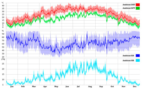 Figure 8 shows the annual profile of the climatic ambient air conditions of Multan (Pakistan). The daily, hourly, and monthly variation of dry-bulb temperature shows that cooling inside the greenhouse environment is mostly required in summer months (i.e., May to August). However, the applicability of standalone pad-type direct evaporative cooling systems is limited during the monsoon (heavy rainfall season, i.e., July to August, shown in Figure 8, humidity ratio (HR)) which results in excess relative humidity in the air. Consequently, a desiccant dehumidification-based Maisotsenko cycle evaporative cooling system was thermodynamically analyzed for the climatic conditions of Multan. Accordingly, results from the study are presented in Figure 8, Figure 9, Figure 10, Figure 11, Figure 12 and Figure 13, which show the annual representation of the performance of the proposed system and the profile of the vapor pressure deficit inside the greenhouse.