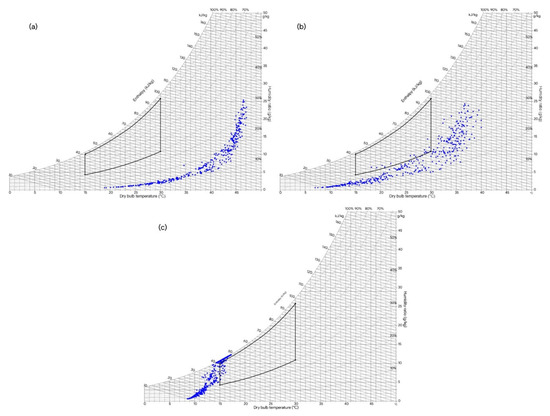 The standalone DAC system created a maximum temperature gradient, i.e., 8.4 °C more at ambient conditions of 38.6 °C with a humidity ratio of 21.6 g/kg at ambient conditions of 25 g/kg, which lies well outside the required greenhouse optimum temperature and humidity conditions (Figure 9a). It is worth mentioning that the temperature gradient is defined as the difference between the dry bulb temperature of the ambient air and the dry bulb temperature of the product air at the system outlet node. The studied standalone DAC system created unsuitable thermal and humidity conditions inside the greenhouse throughout the year due to a relatively higher temperature and very dehumidified air (Figure 9a). According to Figure 9b, the standalone DAC system coupled with a sensible heat exchanger (DAC+HX) (working efficiency assumed to be 0.9) created a maximum temperature gradient, i.e., 0.77 °C more at ambient conditions of 39.2 °C with a humidity ratio of 16.8 g/kg at ambient conditions of 24.3 g/kg, which lies slightly outside the required greenhouse optimum temperature and humidity conditions (Figure 9b), and is very close to ambient air conditions. The studied DAC+HX system created very close thermal and humidity conditions to ambient conditions inside the greenhouse throughout the year. Figure 9c shows the psychrometric profile of temperature and relative humidity of the desiccant dehumidification-based Maisotsenko cycle evaporative cooling (M-DAC) system for the climatic conditions of Multan (Pakistan). According to Figure 9c, most of the hourly points of the M-DAC system lie inside the required thermal and humidity conditions of the greenhouse environment. The M-DAC system created a maximum temperature gradient i.e., 21.98 °C. According to Figure 9c, the M-DAC system coupled with a sensible heat exchanger (working efficiency assumed to be 0.9) created a maximum temperature gradient i.e., 21.9 °C more at ambient conditions of 39.2 °C with a humidity ratio of 16.8 g/kg at ambient conditions of 19.6 g/kg, which lies well inside the required thermal and humidity conditions inside the greenhouse environment (Figure 9c).