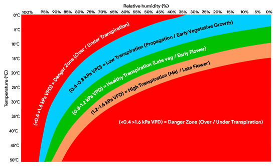 Figure 10 shows the vapor pressure deficit (VPD) profile and growth stages of plants inside a greenhouse (for the temperature of the leaf equal to the temperature of the air inside the greenhouse environment). According to Figure 10, the VPD of <0.4>1.6 kPa is considered an extremely dangerous zone for over/under transpiration. The VPD of 0.4–0.8 kPa is considered a slightly low transpiration zone (propagation/early vegetative growth of the plants). The VPD of 0.8–1.2 kPa is considered a healthy transpiration zone (late vegetation/early flowering stage of the plants). The VPD of 1.2–1.6 kPa is considered a high transpiration zone (mid/late flowering stage of the plants).