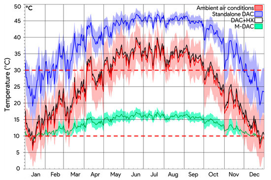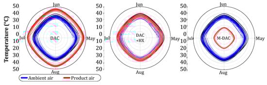 Figure 11 shows the temperature profile of the studied systems against the ambient air conditions of Multan (Pakistan) for greenhouse air-conditioning application. The ambient air conditions lie outside the required temperature conditions (marked by the dotted red line, Figure 11) from April to September (i.e., typical summer months) of Multan. Air-conditioning is required inside the greenhouse environment during the summer months. Only M-DAC system created a uniform temperature gradient which lies well inside the required temperature conditions (marked in dotted red line, Figure 11) of the greenhouse environment. Figure 12 shows the temperature gradient of the DAC, DAC+HX, and M-DAC system in the summer months (i.e., May to August) for the greenhouse air-conditioning for the climatic conditions of Multan (Pakistan). The DAC system created higher than ambient temperature conditions throughout the summer months, which is unsuitable for greenhouse air-conditioning requirements (Figure 12). The DAC + HX system created slightly higher/very close to ambient temperature conditions throughout the summer months, which is also not suitable for greenhouse air-conditioning requirements (Figure 12). The M-DAC system created a temperature gradient which is highly suitable for the required temperature conditions throughout the summer months for greenhouse air-conditioning application (Figure 12).