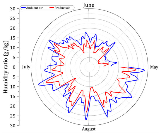 Figure 13 shows the dehumidification profile of the desiccant dehumidification unit of the proposed system for the summer months (i.e., May to August) for the climatic conditions of Multan (Pakistan). The desiccant dehumidification unit created a maximum dehumidification gradient of the ambient air, i.e., 6.61 g/kg at ambient conditions of 14.14 g/kg. It is worth mentioning that the dehumidification gradient is defined as the difference between the ambient air humidity ratio and the humidity ratio of the product air exiting the outlet of the proposed system. Compared to current proposed passive cooling techniques for greenhouse air-conditioning (i.e., pad-and-fan type systems for greenhouse air-conditioning systems), the proposed M-DAC system has the ability to manipulate the moisture inside the greenhouse environment, which is a key factor in defining the vapor pressure deficit inside the greenhouse. In turn, this defines the growth rate and ultimately results in better yield and fruit quality. Moreover, the M-DAC system can easily achieve the required temperature conditions inside a greenhouse compared to passive cooling techniques, i.e., pad-and-fan type AC systems.