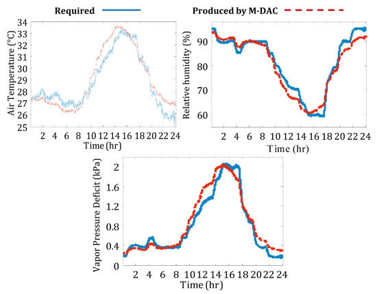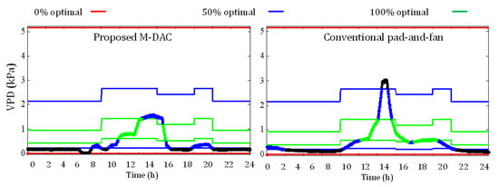 A more in-depth result for comparing the performance of the M-DAC system and evaporative pad-and-fan system in a random day of cultivation under fruit formation growth stage is provided by means of the Cft-ratio model in the plots of Figure 16. In Figure 16, the reference conditions related to the optimal, marginal, and failure vapor pressure deficit (i.e., are presented with a green solid line, blue solid line, and red solid line, respectively. The Cft-ratio Simulink model then determined the percentage of VPD data of each case, shown in Figure 16 that were inside each reference border. From the graphical presentation, it is evident that the VPD data from the M-DAC system resulted in a higher comfort ratio than those from the evaporative pad-and-fan system. In detail, VPD values resulting from the M-DAC system never crossed the marginal reference border, whereas for the conventional pad-and-fan case, during the hours of 13:30–14:30, VPD exceeded this border and increased to 3 kPa, which is considered a failure value for greenhouse production. Sample results of the comfort ratio model for comparing the performance of the evaporative system and M-DAC system in providing optimum vapor pressure deficit for greenhouse production are given in Table 3 for two different growth stages of the tomato plant.