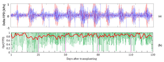 Validation of the performance of the proposed M-DC system with respect to the required optimal influential parameters of the greenhouse microclimate (i.e., temperature of the air, inside RH, and vapor pressure deficit) is shown in the plots of Figure 14 for 24 h. Results clearly show that the output of the M-DAC system was very close to the requirement microclimate data generated by the OptDeg model for the vegetative to mature fruiting growth stages. Moreover, the VPD plot implies that during the mid-day hours (i.e., 13:00–17:00) when the air temperature was at the highest peak and relative humidity had the lowest values, the VPD increased to 2 kPa, which is consistent with the output of the M-DAC system. Results of the VPD data generated from the OptDeg model for actual greenhouse tomato cultivation in 130 days versus the simulated VPD data generated from the M-DAC system are plotted in Figure 15. The first derivative of the VPD data sets, plotted in Figure 15a, shows that the optimum VPD values from the OptDeg model and the VPD values from the M-DAC system are not significantly different. This finding was also verified using the one-way analysis of variance (ANOVA) test for each of the five growth stages. Figure 15b shows the deviation of the VPD data of the M-DAC system from 100% optimal condition (), and compares that with actual VPD data of a commercial greenhouse that operated with ventilation and a pad-and-fan evaporative cooling system.