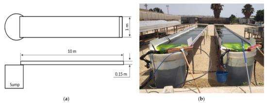 The raceway and thin-layer photobioreactors used for the tests are located at the IFAPA center, next to the University of Almería (Almería, Spain). On the one hand, there are two fiberglass thin-layer reactors with similar characteristics formed by a shallow channel together with a polyethylene tank of a volume of 0.5 m3 (see Figure 1). They have a total area of 10 m2 and they are operated at 0.02 m constant depth (0.45 m3 total volume). At the bottom of the tank, a plate membrane diffuser injects CO2 with a flow rate of 2.2 L·min−1. On the other hand, raceways reactors are made of fiberglass with a total surface of 7.13 m2, operated at 0.12 m constant depth of culture to give the best overall hydraulic performance in terms of power consumption to reduce dark zones. They have also a sump with a volume of 0.2 m3 where a plate membrane diffuser injects CO2 with a flow rate of 10 L· min−1 or air with a flow rate of 5 L·min−1. Mixing is made with a 0.2 m diameter paddlewheel with eight steel blades, operated by an electric motor (see Figure 2).