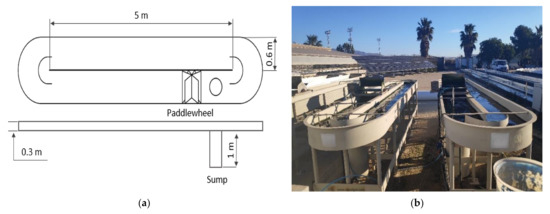 Raceway photobioreactors. (a) scheme (top and side view); (b) raceway view.