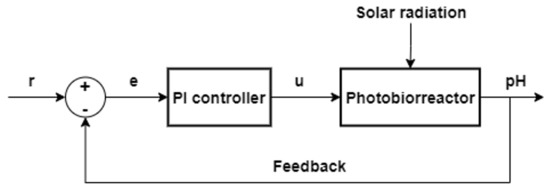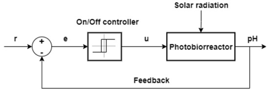 The On/Off control is the most common method of operation for photobioreactors, mainly operated for the daytime period. In this control, when the injection valve opens, CO2 is injected until the pH measurement falls below the setpoint (in this case, the optimum pH of 8) then, the control valve closes until the pH reaches a value above the set point, and so on. The control architecture for this case is shown in Figure 3.