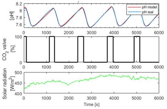 Calibration and validation of the models were carried out from the different dynamics obtained. The input variable for all models is the opening of the CO2 valve (0% to 100%), while the solar radiation acts as a disturbance in the case of the daytime period. To obtain a model that relates CO2 injection with pH, it is necessary to take into account different situations. In this case, tests were carried out on similar days to consider constant the small variations in radiation and temperature. Figure 5 and Figure 6 show an example of validation of the day and night models contrasted with real data. Specifically, they represent the validation of daytime and nighttime models of the thin-layer reactor, using wastewater as a culture medium.