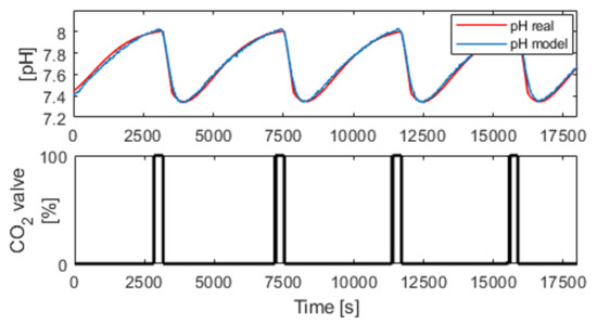 Thus, in this work, the pH dynamics were obtained by applying a train of pulses around the pH value equal to 8. These tests were performed at daytime and nighttime periods for several days, giving rise to two different dynamics for daytime and nighttime periods, respectively. The linear resulting models are based on first-order transfer functions that relate the pH output with the CO2 injection and the solar radiation effects [9,20]: