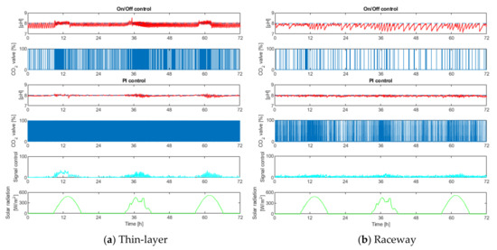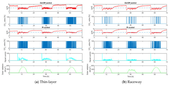 Figure 7 represents On/Off and PI control approaches operated only during the daytime period. Looking at the left side of the figure, the first graph shows the evolution of the pH with an On/Off controller for three days in thin-layer reactors. The daytime variation of pH ranges from 7.51 to 8.22 and during the nighttime period, the pH reaches values of 8.89. The third graph shows the evolution of the pH with a PI controller, where the daytime variation of pH ranges from 7.78 to 8.18, and during the nighttime period, the pH reaches values of 8.59. On the right of the figure, the same test carried out in raceway reactors is shown, where the daytime variation of pH, with On/Off controller, ranges 7.56 to 8.03, and during the nighttime period, the pH reaches values of 8.74. The daytime variation of pH, with PI controller, ranges from 7.90 to 8.04, and during the nighttime period, the pH reaches values of 8.94. At night, where the system is in an open loop, pH values far from the reference are reached. The disconnection point of the controller is differentiated, causing an increase in pH during the night period and a sudden change in pH at the beginning of the day due to the high injection of CO2 (control signal value 100%), being able to cause stress situations of the culture.