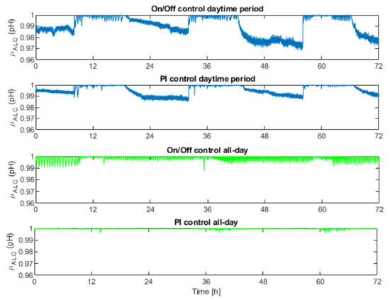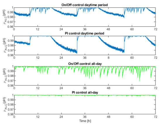 Figure 9 and Figure 10 represent this factor for each control architecture in both reactors. It can be seen, as mentioned above, that the control throughout the day obtains values closer to 1, while during the night the values decrease when the control is not active. Specifically, the PI control throughout the day is the one that obtains the best results. Note how controlling the pH during 24 h a day with a PI controller, this term remains close to 1 all the time, which means that the growth rate is maximized according to the pH effect.