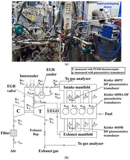 2 concentration in the burned gases. However, the main drawback of EGR is that it leads to higher soot formation and a lower combustion efficiency. EGR systems can be of the high pressure (HP-EGR) or low pressure (LP-EGR) types, depending on the position in which the exhaust gas is taken for recirculation (i.e., upstream or downstream from the turbine, respectively). In normal production engines, the EGR system is managed by the air-path controller inside the engine control unit (ECU). In particular, the air-path controller typically adjusts the EGR valve position and the turbocharger controller device, such as the rack position for a VGT (Variable Geometry Turbine), in order to achieve optimal set points of the intake air mass (or of the intake O