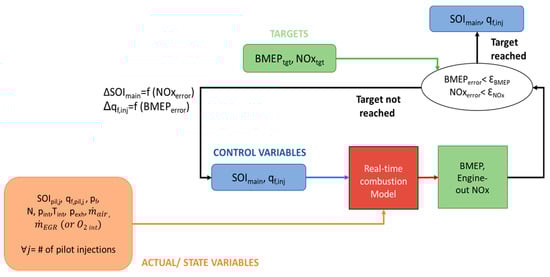 An approach of this type requires an accurate and fast model to estimate the engine-out NOx levels and the BMEP on a cycle-by-cycle basis. This model can be used within a control loop, which defines the values of the injected fuel mass and of the start of injection of the main pulse in order to reach the targets of NOx emissions and of BMEP within each engine cycle.