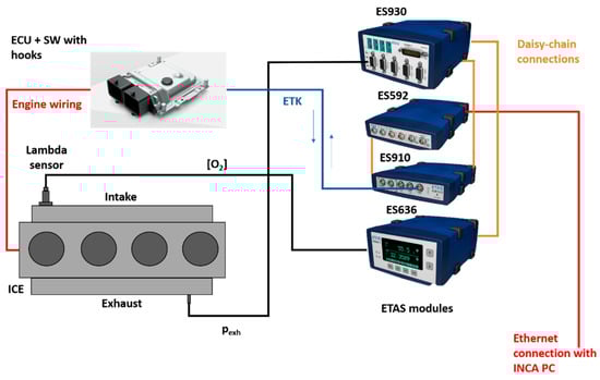 The calibration of the oxygen span concentration was made on the basis of the value taken from the exhaust gas analyzer when the engine was not running (i.e., 20.6 %). A pressure compensation was also made by selecting this option from the ETAS ES636 module (see