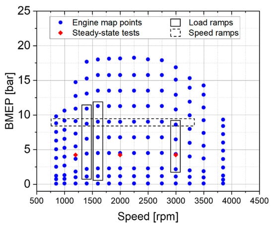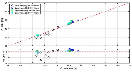 Figure 9) were also performed in order to verify the functionality of the calibrated oxygen sensor and to check its accuracy in comparison with the values read by the oxygen sensor of the test cell (which features the highest accuracy). It is worthwhile noting that additional tests (i.e., a load ramp at N = 1600 rpm and a speed ramp test at BMEP = 9 bar) were used for the validation of the intake O
