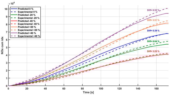 Figure 14 shows the simulated and experimental trends of the cumulative NO