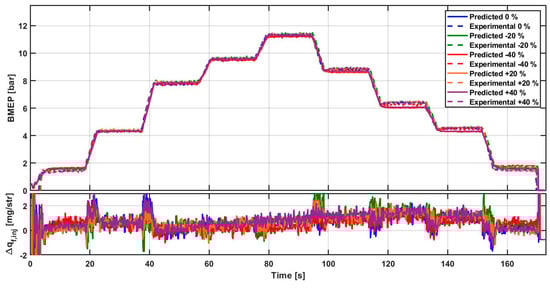 In contrast to the results obtained for the load ramp #1, NOx emission control is more accurate for the load ramp #3. A reasonable explanation for this result is that the transient thermal effects (that are not handled by the current version of the combustion model) are more significant at lower speed conditions (i.e., at N = 1400 rpm). Therefore, in those conditions, the NOx levels that are emitted by the engine deviate significantly from the corresponding steady-state points in warm conditions. Furthermore, the BMEP control remains very accurate also for this load ramp test at N = 3000 rpm.