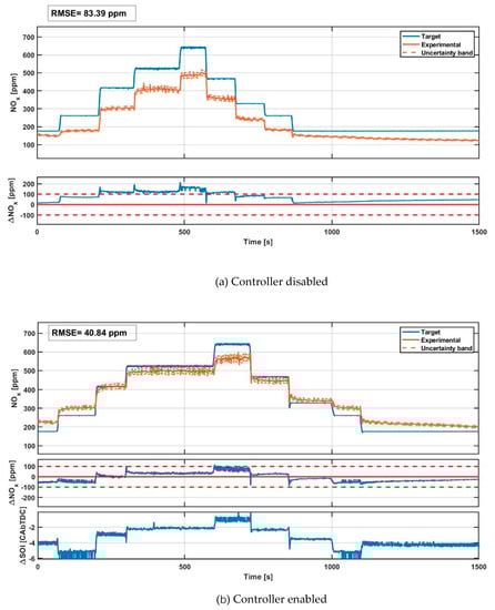 x levels, with respect to the desired targets, especially at medium-low loads. However, an error peaking at about 150 ppm occurs around the middle part of the ramp test. It will later be clarified that this error is partly due to model prediction error, and partly due to engine thermal state effects on NO