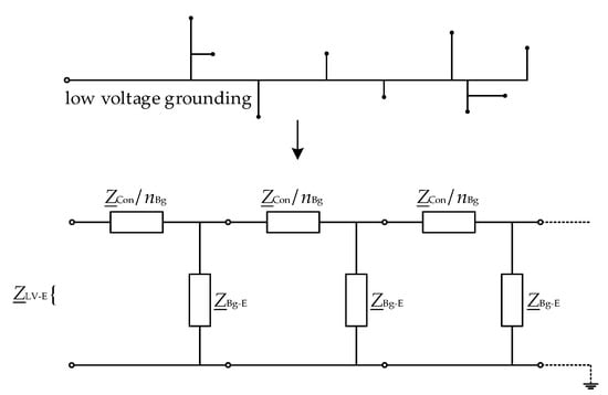 The values in the Equations (14) and (15) represent quadripole parameters of the chain form and assume the earth connections to be equally distributed along the network, as shown in Figure 5. Here, is the thought impedance of the conductor, expanded over the length ℓ of the outgoing feeder. describes the adopted grounding impedance for one building, while is the number of buildings, which are supplied by the same low voltage feeder. With , the input impedance for a single low voltage line is calculated with: