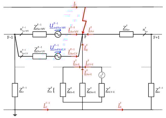 If there is a single-pole ground fault occurring at a substation, there will be a superposition of currents at the fault node (index ), as shown in Figure 6. This conclusion is also drawn in Fickert et al. [13].