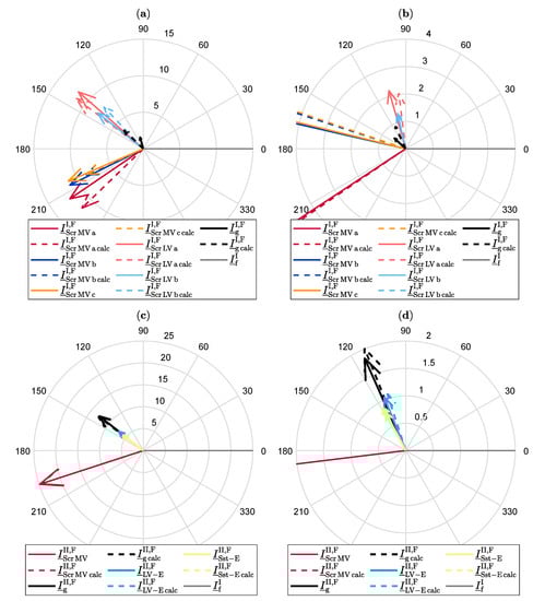 The screen currents on the feeding side are primarily driven by the voltage induced into the screen-earth loop. Due to its inductive origin described by Equation (3), the summarised screen current has a phase angle close to relative to that of the fault current . This leads to a neutralization at the fault node and thus to a lower grounding current . The current can be determined and measured as a difference of the fault current and the screen currents and . It should be noted that the screen current might not only contain the current share of the medium voltage screens (index MV), but also the current flowing through other conductors (index LV) running in parallel, as indicated in Figure 6 and given in Equation (20).