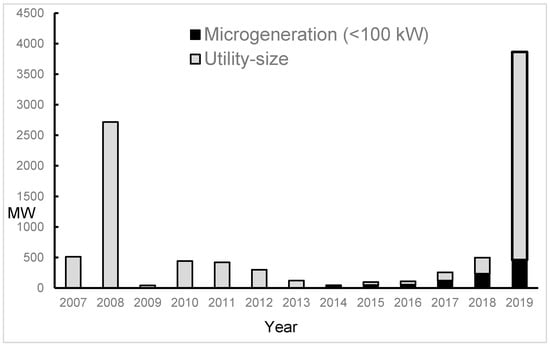 Annual photovoltaic capacity additions in Spain (2007–2019). Source: [38] (pages 41 and 76).