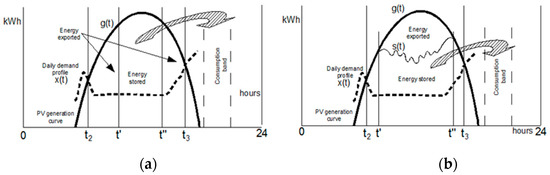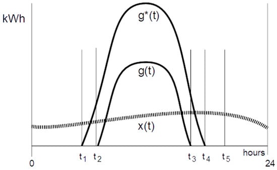 Figure 2 shows the character of the decision on the power of the plant according to a stylized model. The x(t) curve represents the minimum daily domestic consumption of electricity, that is, when no one is at home or when the electricity consumption is restricted to the maximum at will, g(t) is the minimum generation curve that can be expected (normally the curve on cloudy days or, more generally, on autumn and winter days). Finally, g*(t) is the maximum generation curve, whether it is instantaneously considered (e.g., in a Mediterranean climate, the clear days of spring), or whether it is understood as the daily maximum generation (which happens on summer days because there are many daylight hours).
