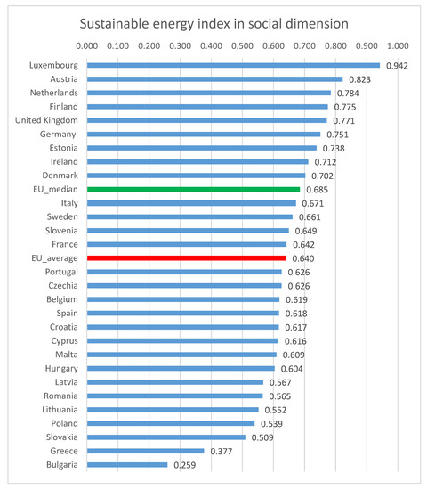 Fifteen of the EU-28 Members States have social index values below the EU average. Leaps between the index values for certain groups of countries can be noticed. Bulgaria and Greece are unfavorably lagging behind the rest of the EU countries, while Luxembourg is a positive outlier. Bulgaria has an index value of 0.259, which is 2.5 times worse than the EU average. Greece’s index value of 0.377 is more than 1.5 times worse than the EU average. The category responsible for such a low result of Bulgaria is equity (index value of 0.19), especially the disparities sub-category index with a score of 0.107. Meanwhile, the health category index is at a relatively high level of 0.49. The same situation occurs in Greece. The disparities sub-category index is only 0.107. Slovakia, Poland, Lithuania, Romania, and Latvia take next positions from the bottom of the ranking, with similar indexes from 0.51 to 0.57. These results are from 20% to 11% lower than the EU average. The values of indexes in the middle of the ranking are very close to one another, with differences less than 0.05, proving that these countries are similar in the social dimension of sustainable energy development. However, there are sometimes large differences in the partial indexes. For example, Sweden, Slovenia, and France, three neighboring countries in the ranking, have the health category index values of 0.271, 1, and 0.209, respectively.