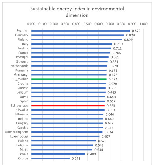 The study reasonably comparable with our environmental dimension index is the one of Cucchiella et al. [27]. The study was performed for EU-28 Member States, the same as our study, but covers data for 2013. The indicators applied cover the “Environment and energy” topic in the Eurostat database. The authors selected nine indicators fairly comparable with the indicators selected in the environmental dimension of our study. The method used is AHP and so it differs from our standardized sums method, the fact that might affect the comparability of results. The authors identify three groups of countries: “Top four” with excellent results; “Higher than EU 28”, covering eight countries, except the top four and “Lower than EU 28”, covering the remaining sixteen countries. The top four EU Member States in 2013 are: Sweden, Denmark, Finland and Austria. The other eight Member States above EU 28 are: Italy, France, Lithuania, Germany, Portugal, Ireland, Croatia and Latvia. In our study for 2017 the top four countries in environmental dimension are: Sweden, Denmark, Finland and Italy. Austria occupy the fifth place. The outcomes seem very similar. The comparison of the second group of EU Member States, “Higher than EU 28”, is impeded since we constructed the index for EU median and EU average, differently to the study of Cucchiella et al. We identified eleven countries above the EU median and sixteen above EU average. It can be seen that the rankings of top seven countries are almost the same in both studies. The rankings for the lower places differ significantly.