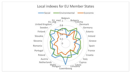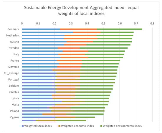 The above procedure helps us calculate the indexes of the three dimensions of sustainable energy, namely: social, economic, and environmental, and local sub-indexes within dimensional categories and sub-categories. These partial indexes allow us to compare the Member States’ performance in separate dimensions, categories, and sub-categories of sustainable energy. Finally, we calculate the Sustainable Energy Development Aggregated Index (SEDAI) for all dimensions, according to the formula: