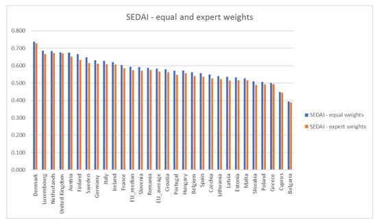 Comparison of SEDAI in 2017 for the EU-28 Member States calculated with the use of equal and expert weighting of indexes for social, economic and environmental dimensions.